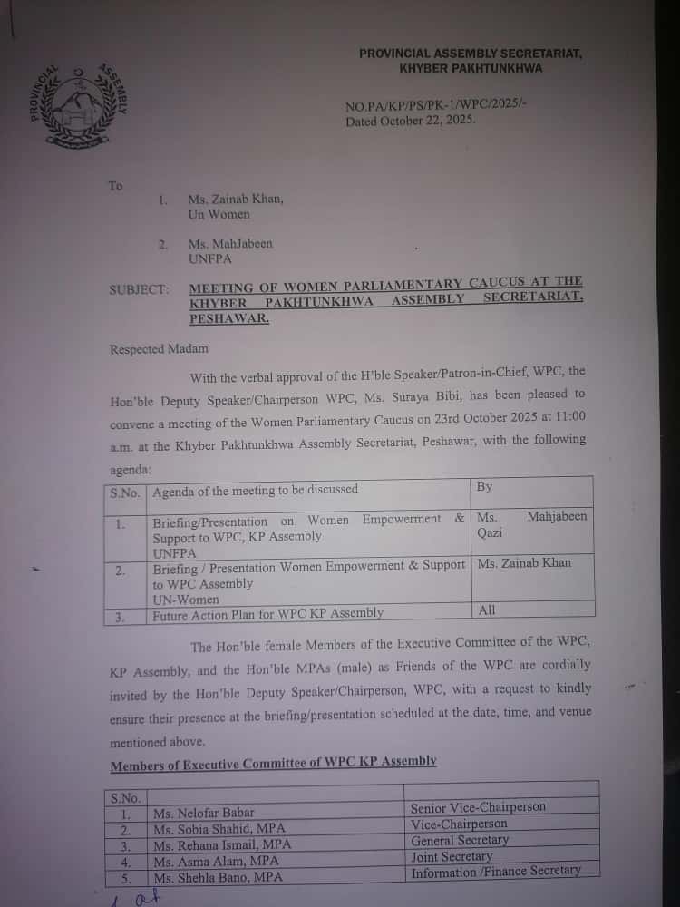 Women Parliamentary Caucus meeting scheduled on 23rd Oct,2025 at 11:00 am in the Provincial Assembly Khyber Pakhtunkhwa